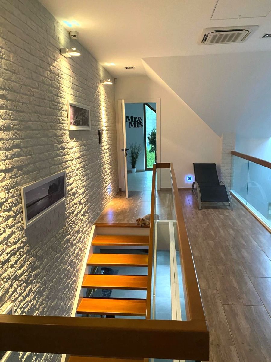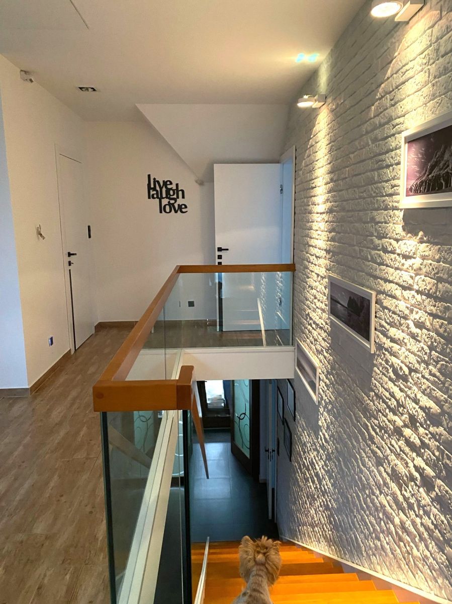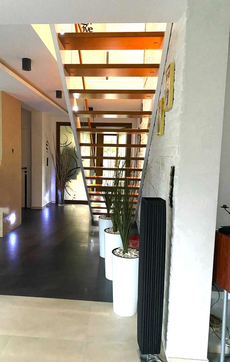 - designerskie akcenty , takie jak szklane balustrady na antresoli, dębowe stopnie schodów, wysokiej klasy gresy, włoski kamień, panele oraz eleganckie żaluzje, tworzą harmonijną i luksusową przestrzeń.