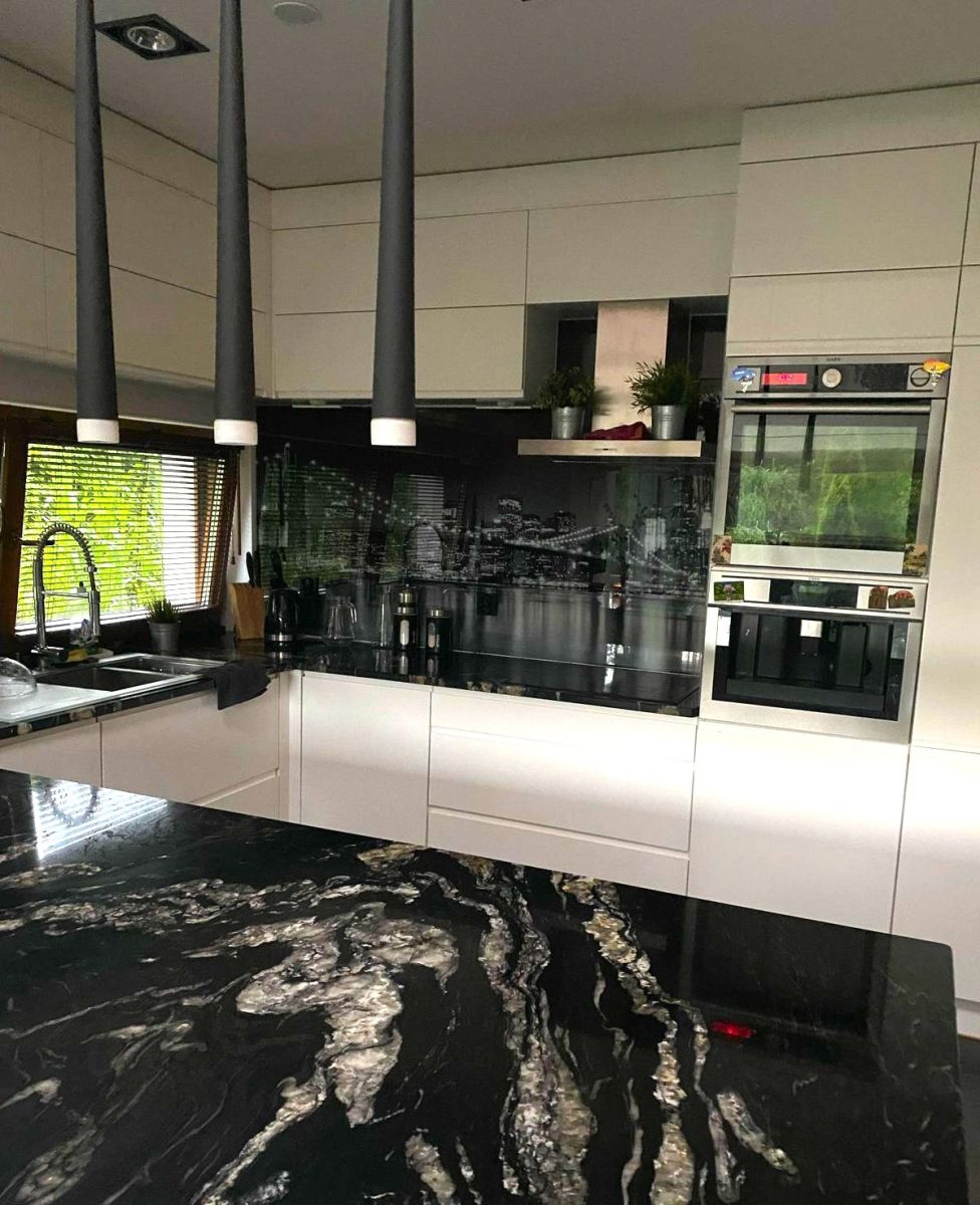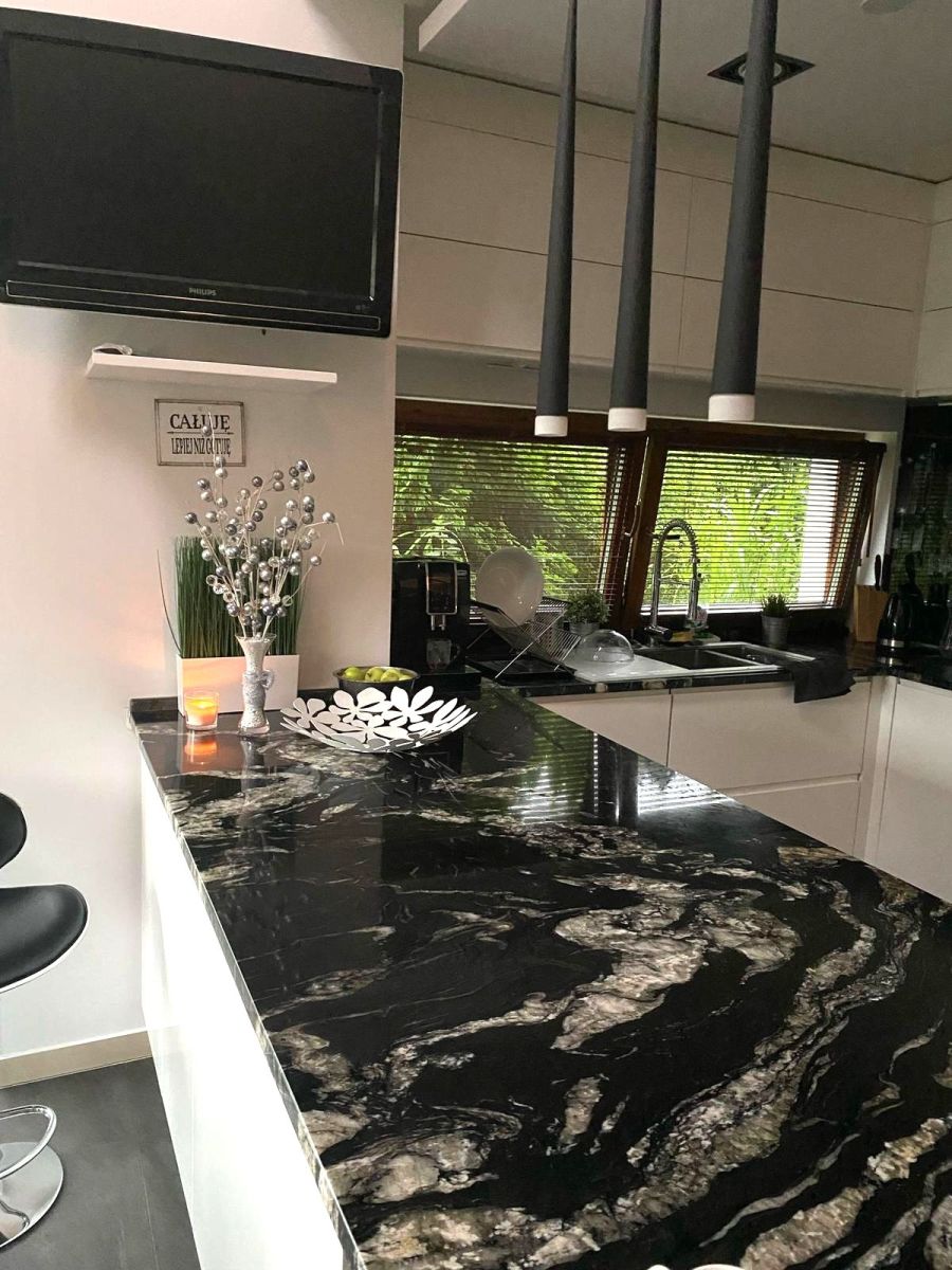 - kuchni z wyspą (6 m²) połączona z jadalnią (10 m²) to marzenie każdego miłośnika gotowania — wyposażona w nowoczesny piekarnik parowy kuchnię indukcyjną, ekspres do kawy oraz podświetlenie od spodu,
