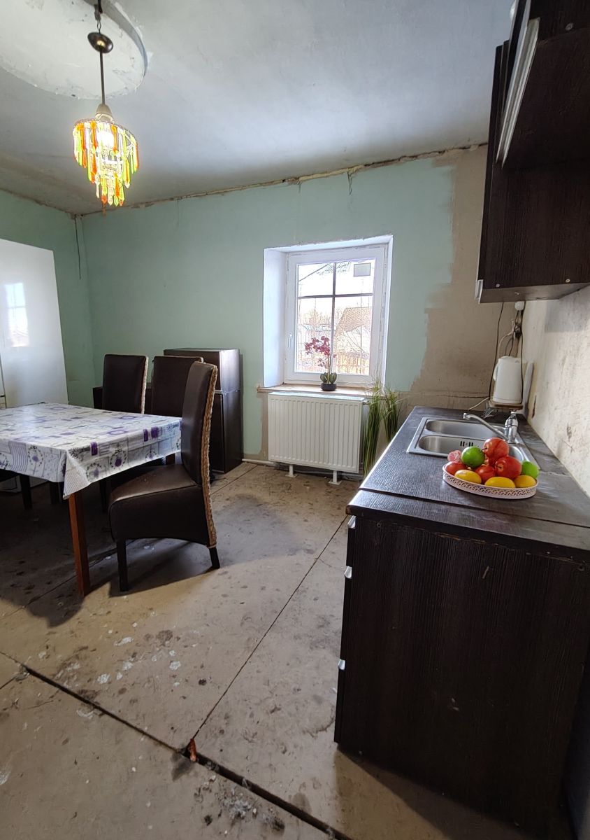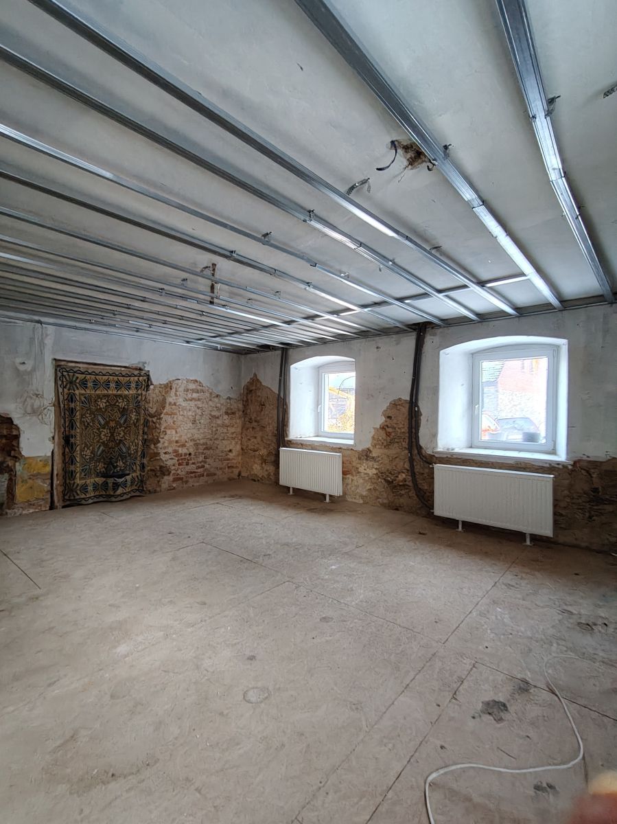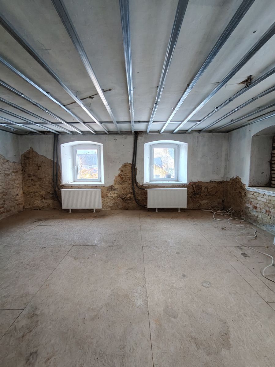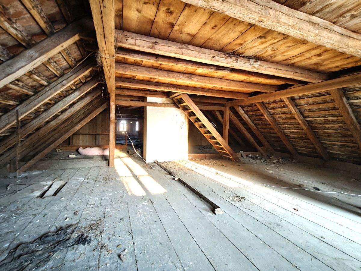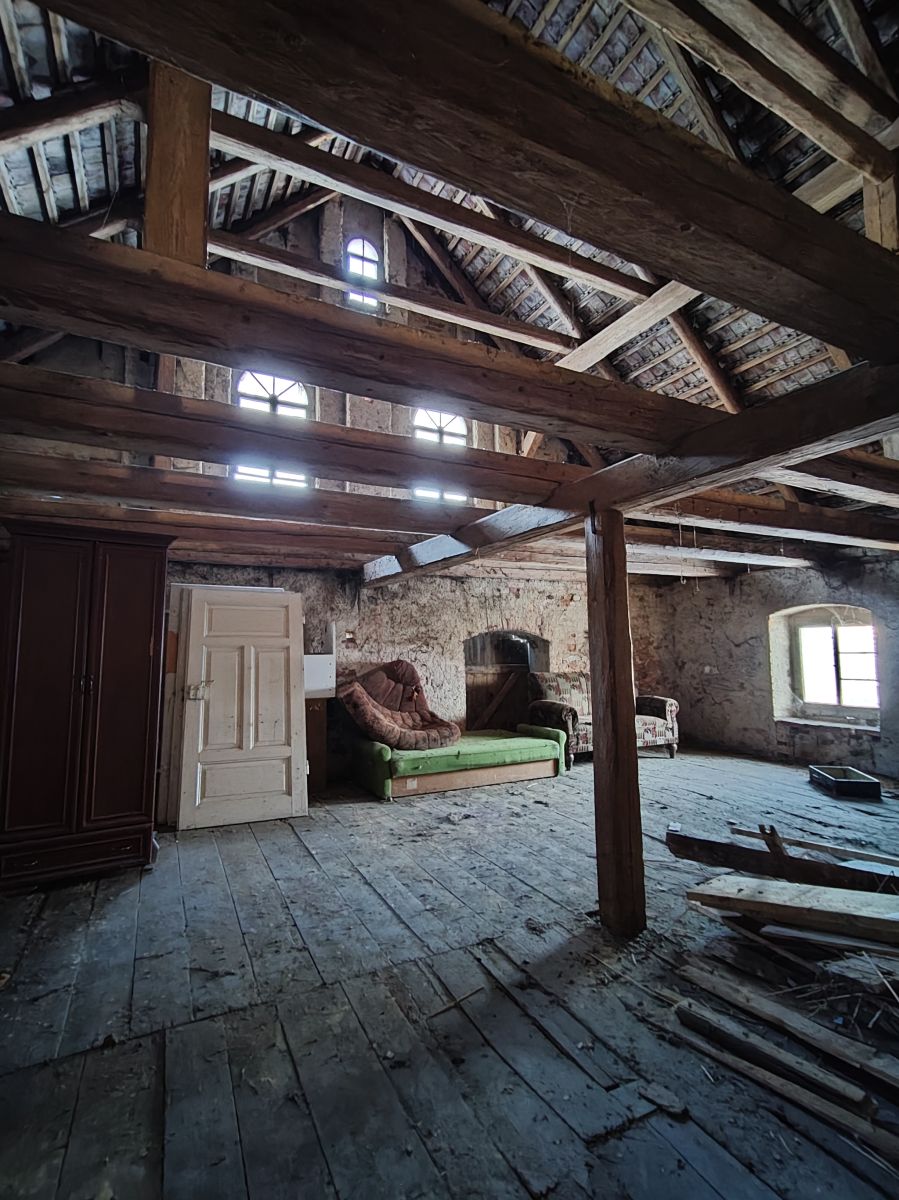 Na końcu przedpokoju znajdują się drzwi frontowe od ulicy, obok których umieszczone jest zejście do piwnicy o powierzchni 25 m², oraz kamienne schody prowadzące na piętro. Na piętrze wita nas przedpokój o powierzchni 18 m², osobny pokój 20 m², kolejne wydzielone mieszkanie o powierzchni 68 m², a także dostęp do dodatkowych przestronnych pomieszczeń (4 pokoje i korytarz, łącznie 109 m²), z drewnianymi schodami wiodącymi na strych. Na poddaszu znajduje się między innymi działająca wędzarnia przy kominie, co czyni tę nieruchomość jeszcze bardziej niezwykłą.