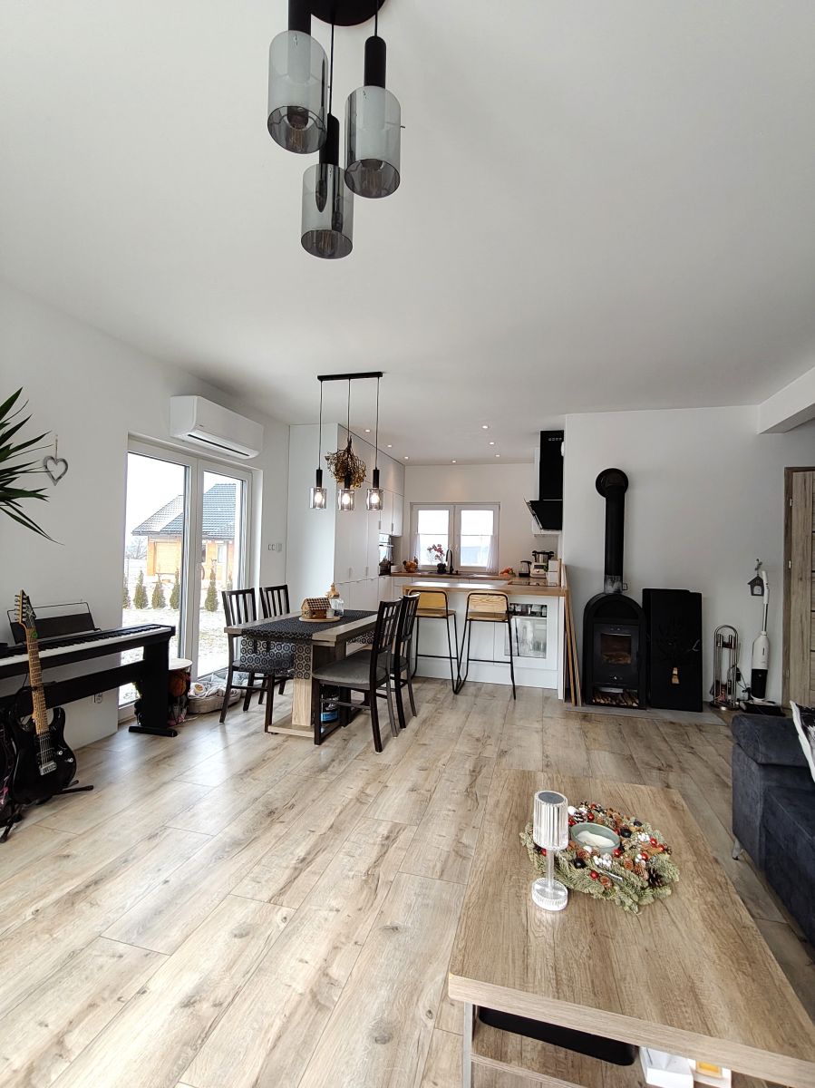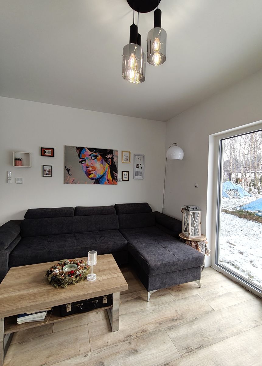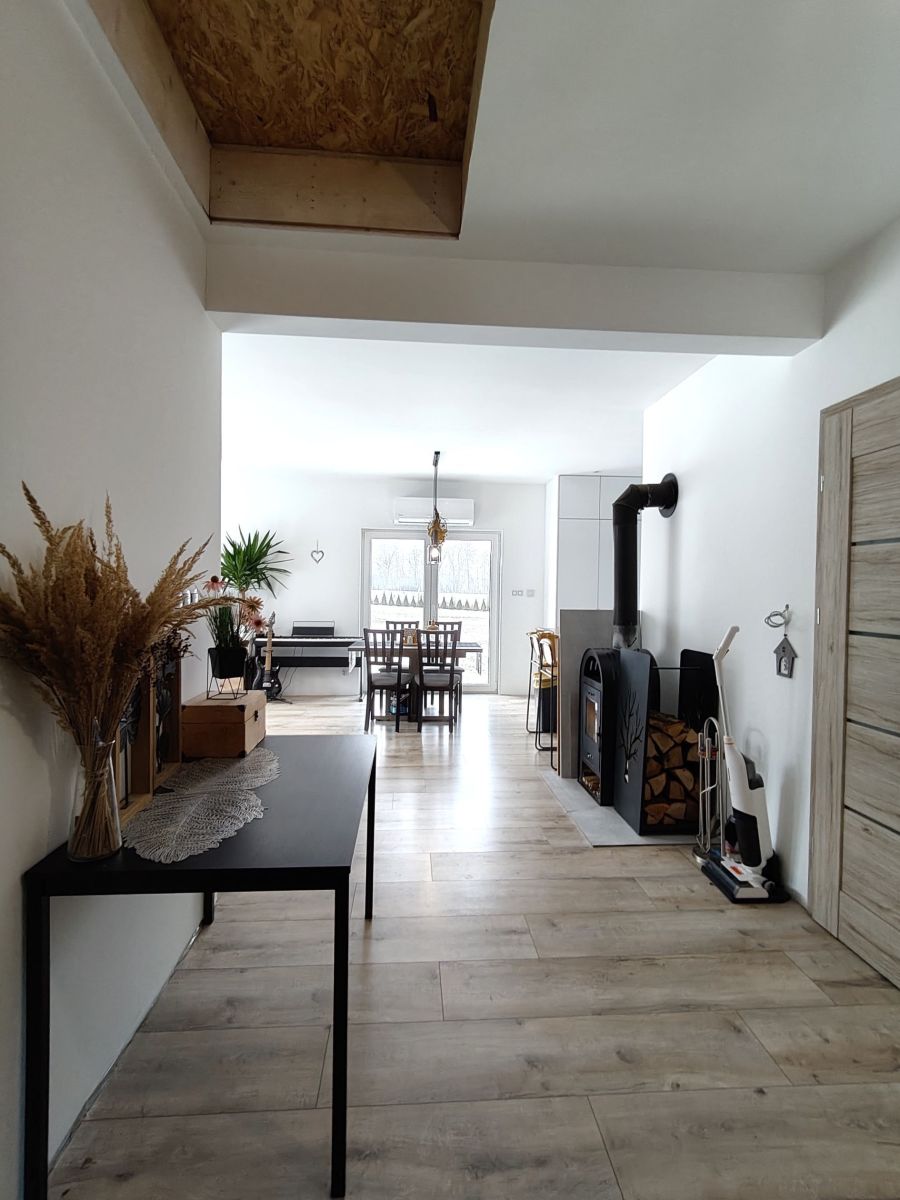 - Przestronny pokój dzienny o powierzchni 27 m² z dwoma szklanymi wyjściami na taras - idealny do relaksu i spotkań z bliskimi, z widokiem na niebo i spektakularne zachody słońca. Do kominka doprowadzona jest wentylacja z zewnątrz.