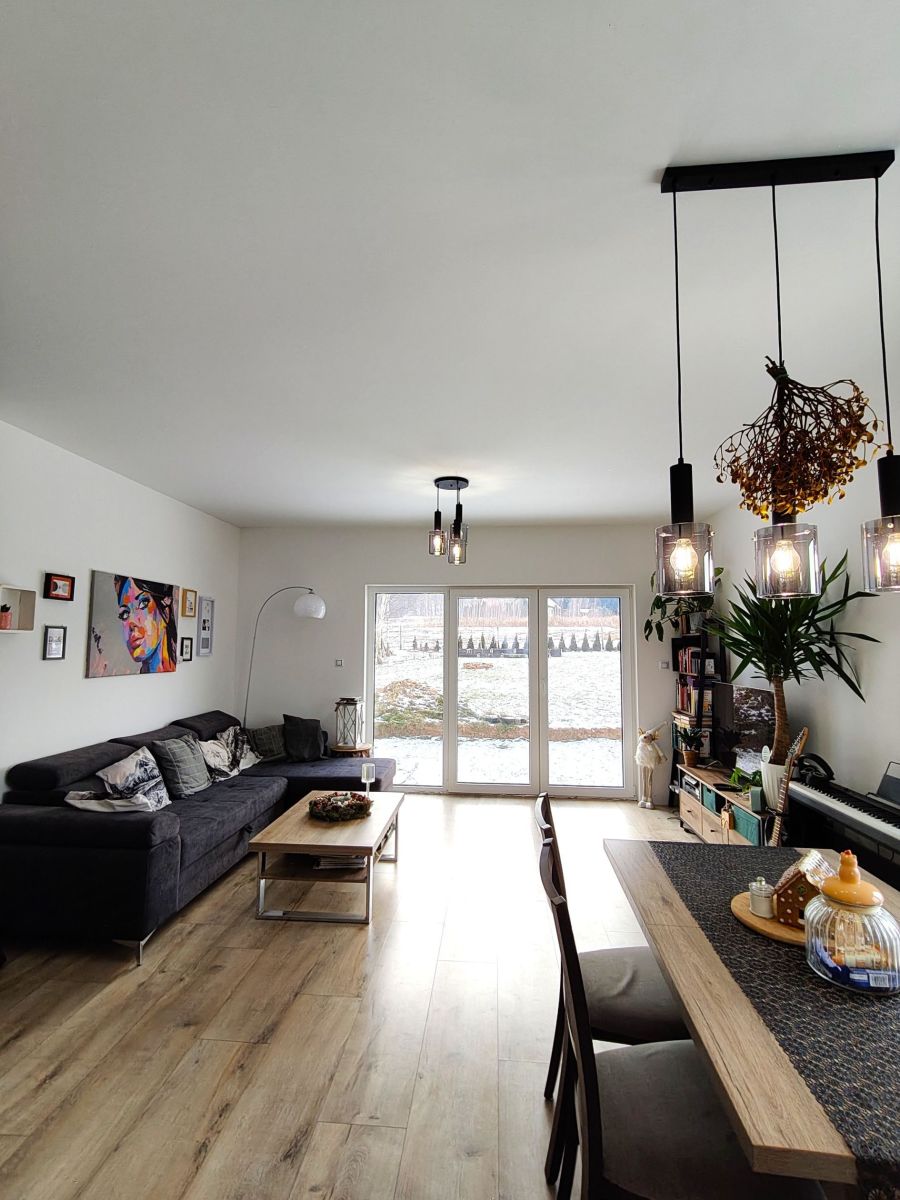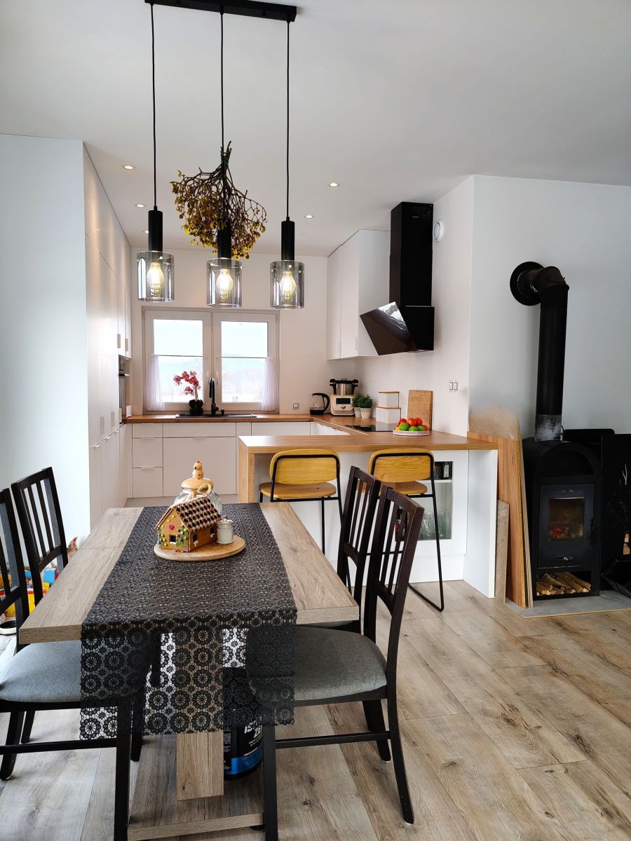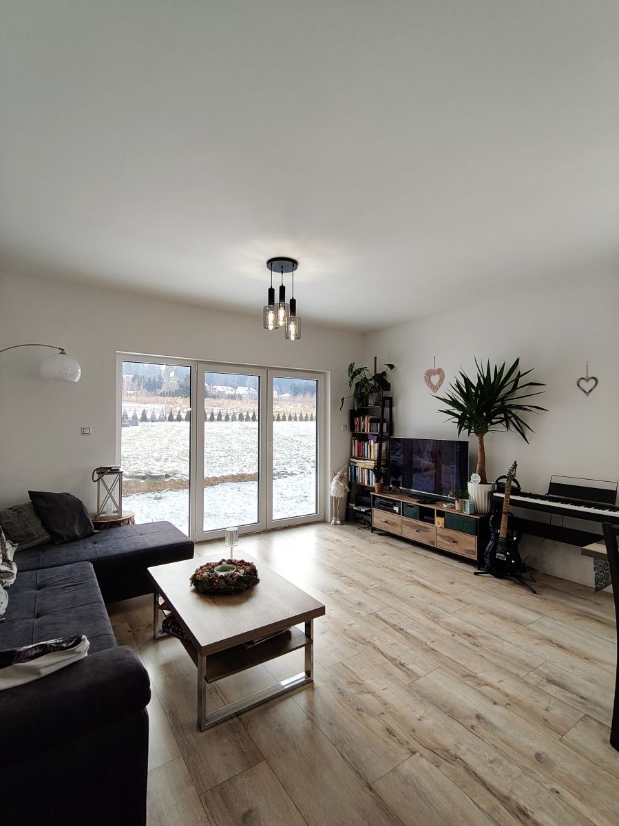 - Przestronny pokój dzienny o powierzchni 27 m² z dwoma szklanymi wyjściami na taras - idealny do relaksu i spotkań z bliskimi, z widokiem na niebo i spektakularne zachody słońca. Do kominka doprowadzona jest wentylacja z zewnątrz.
