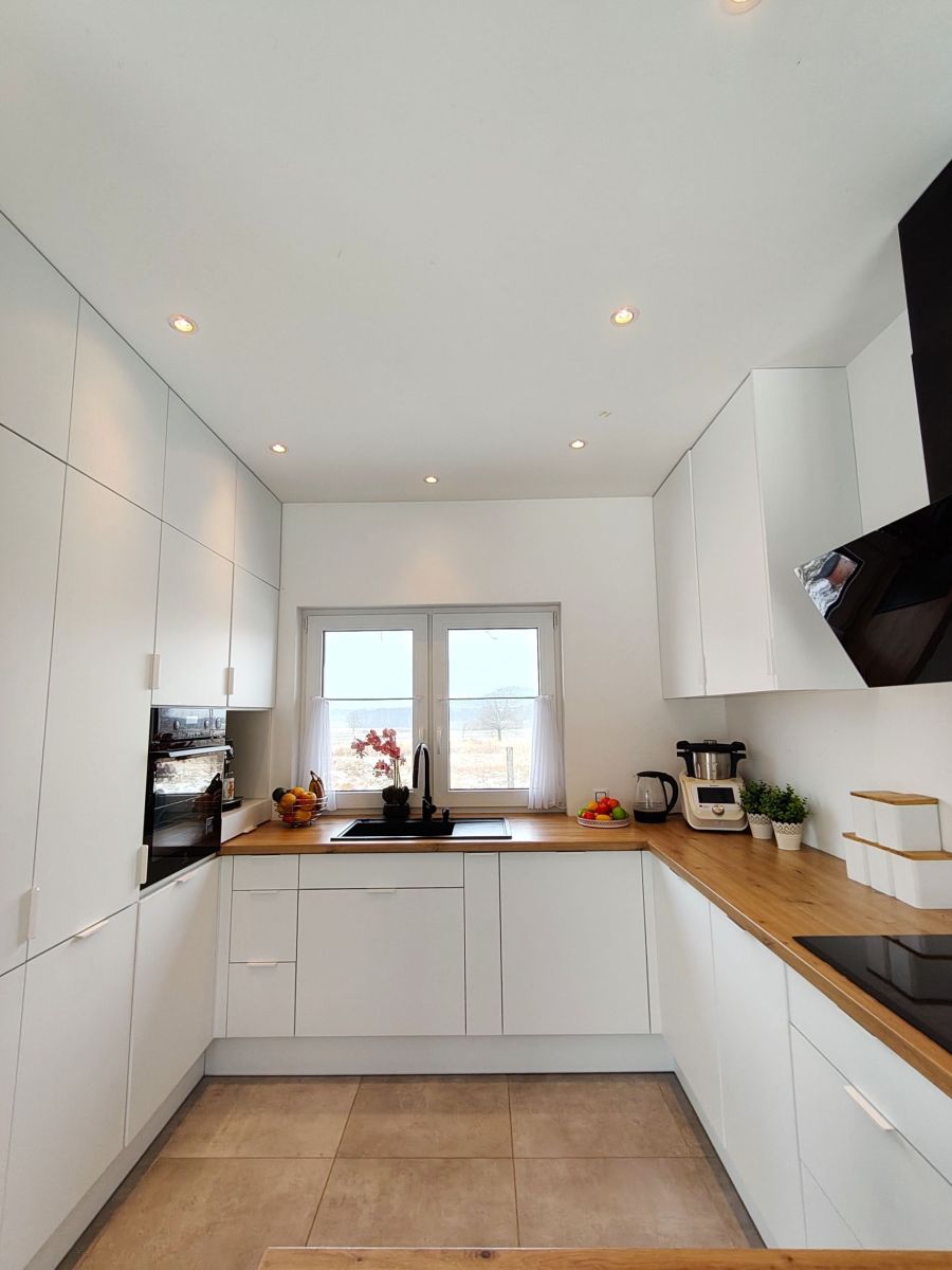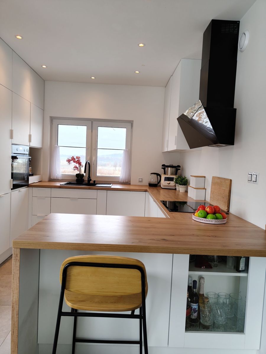 - Funkcjonalna kuchnia o powierzchni 7 m² z oknem, wyposażona w meble pod zabudowę, indukcyjną płytę grzewczą zintegrowaną z okapem i światłem, piekarnik parowy Electrolux, praktyczne narożne szafki z półkami oraz granitowy zlew.